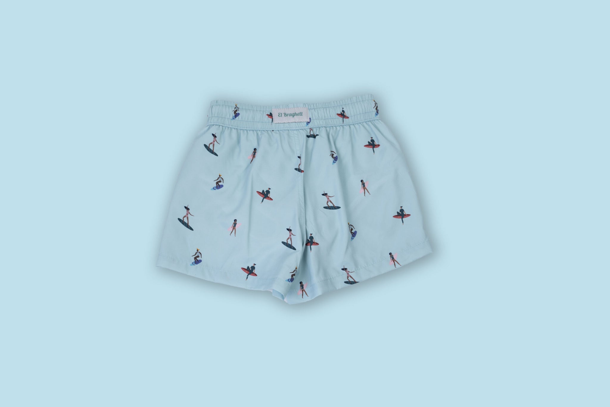 Braghetta da mare bambino fantasia “scarliga sü le unde” con sfondo carta da zucchero e surfiste multicolore