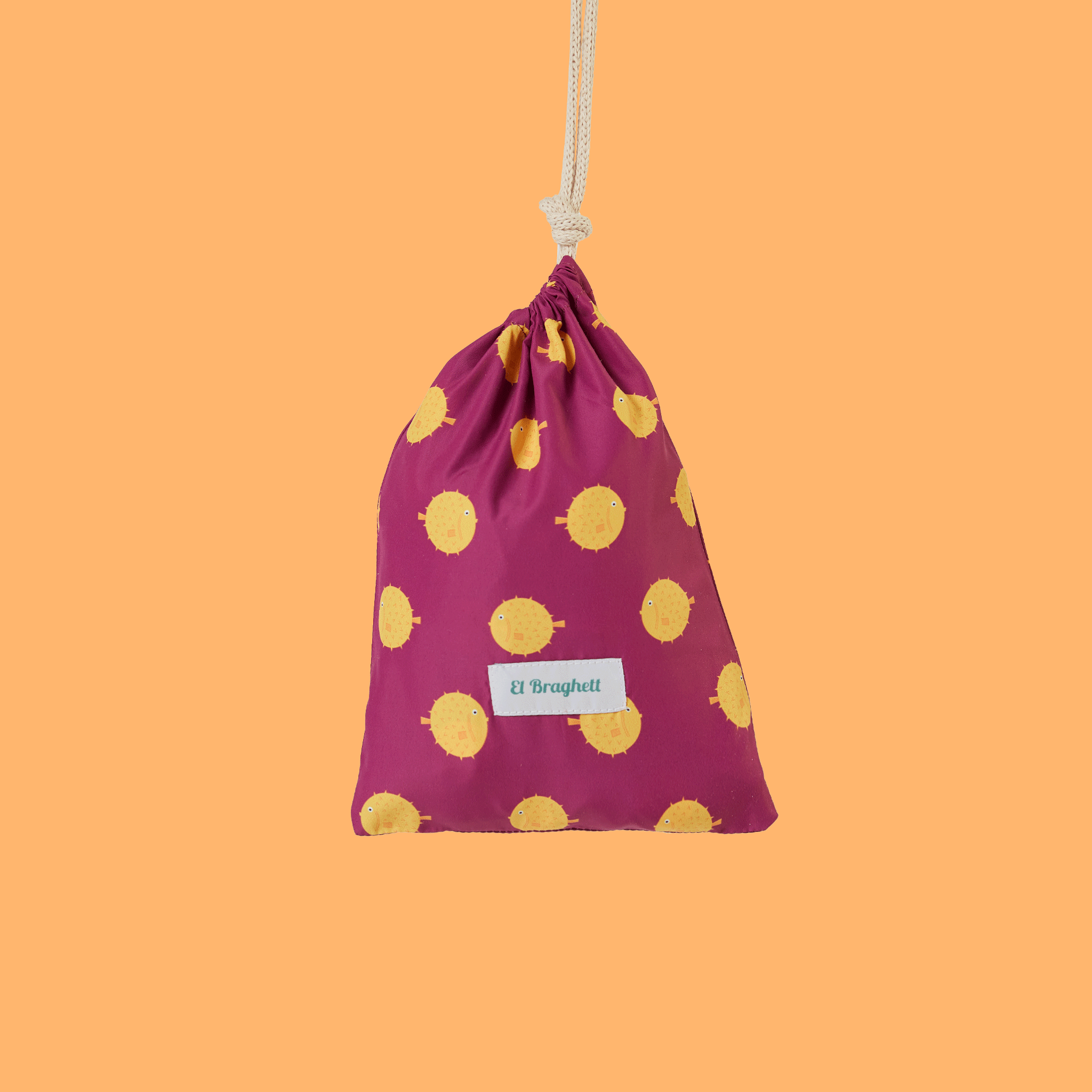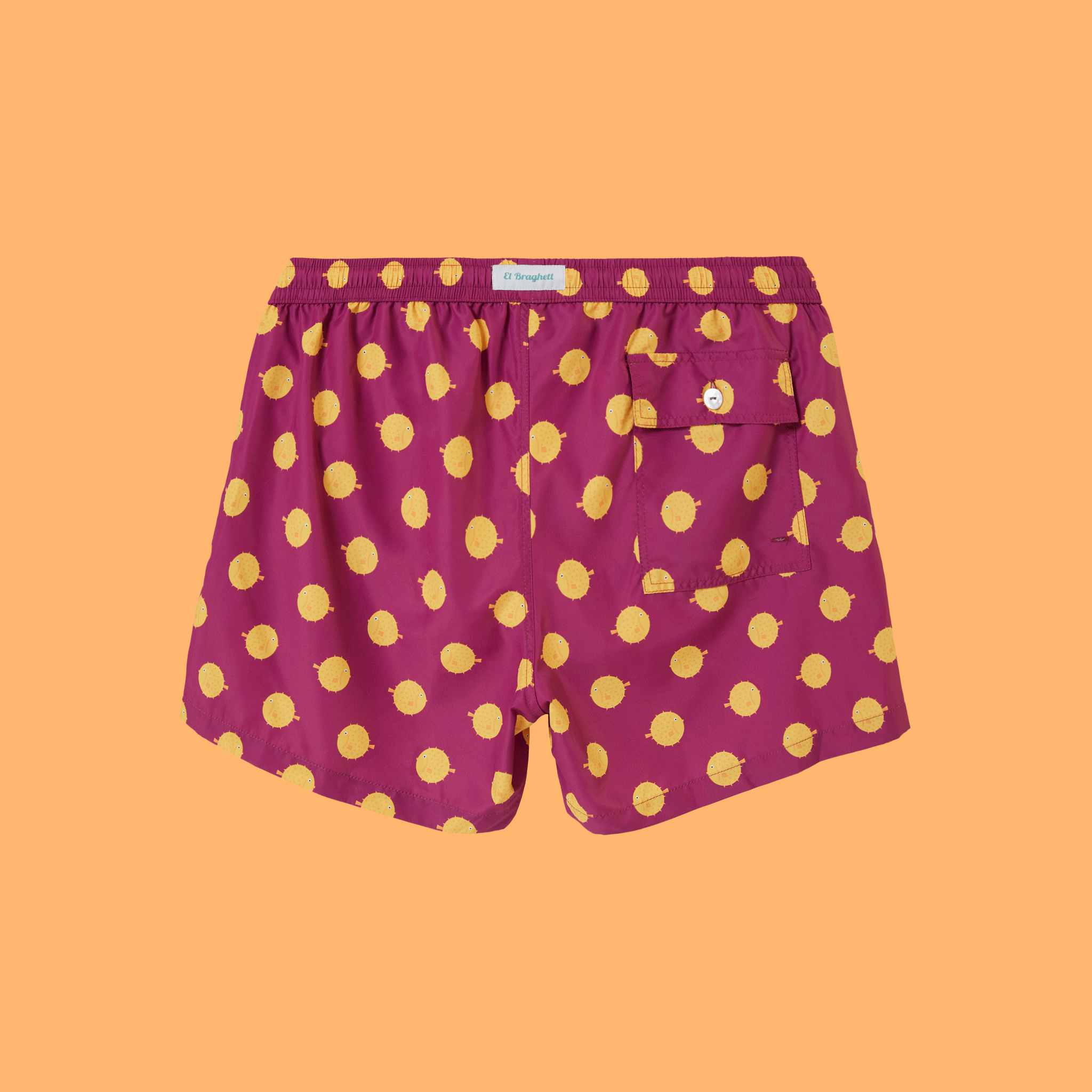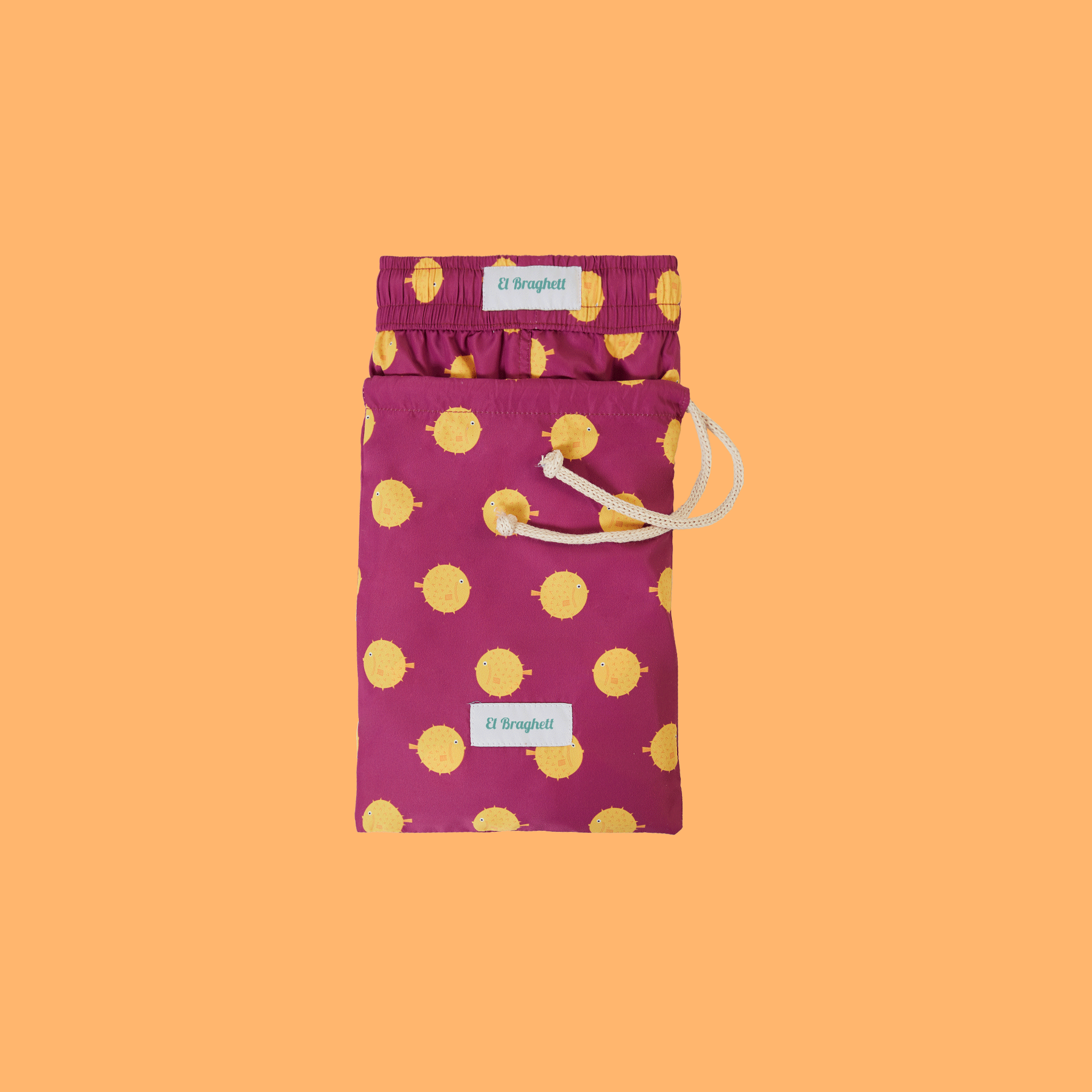 Stampa all over: Pesce palla giallo/arancio su stampa color borgogna.