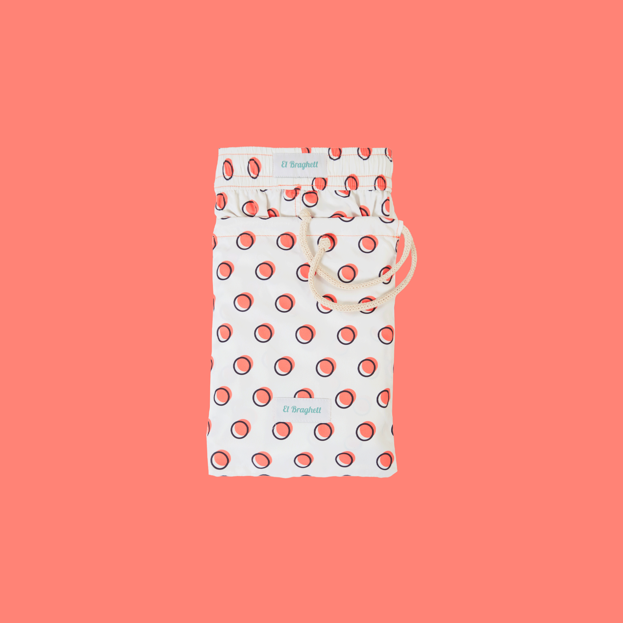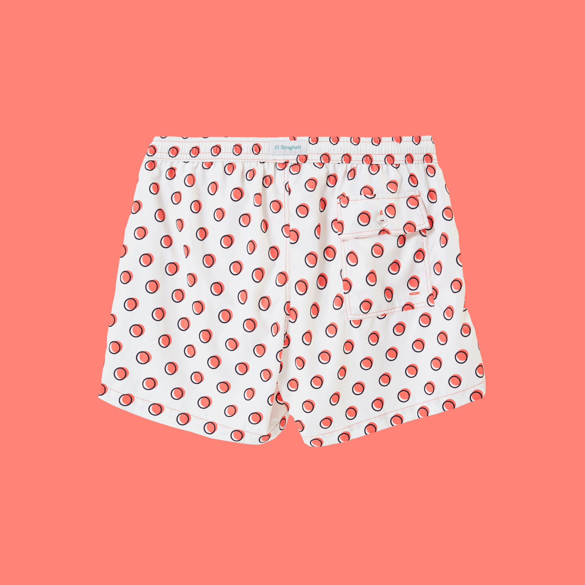 Stampa all over: Pois rosso con contorno nero su sfondo bianco.